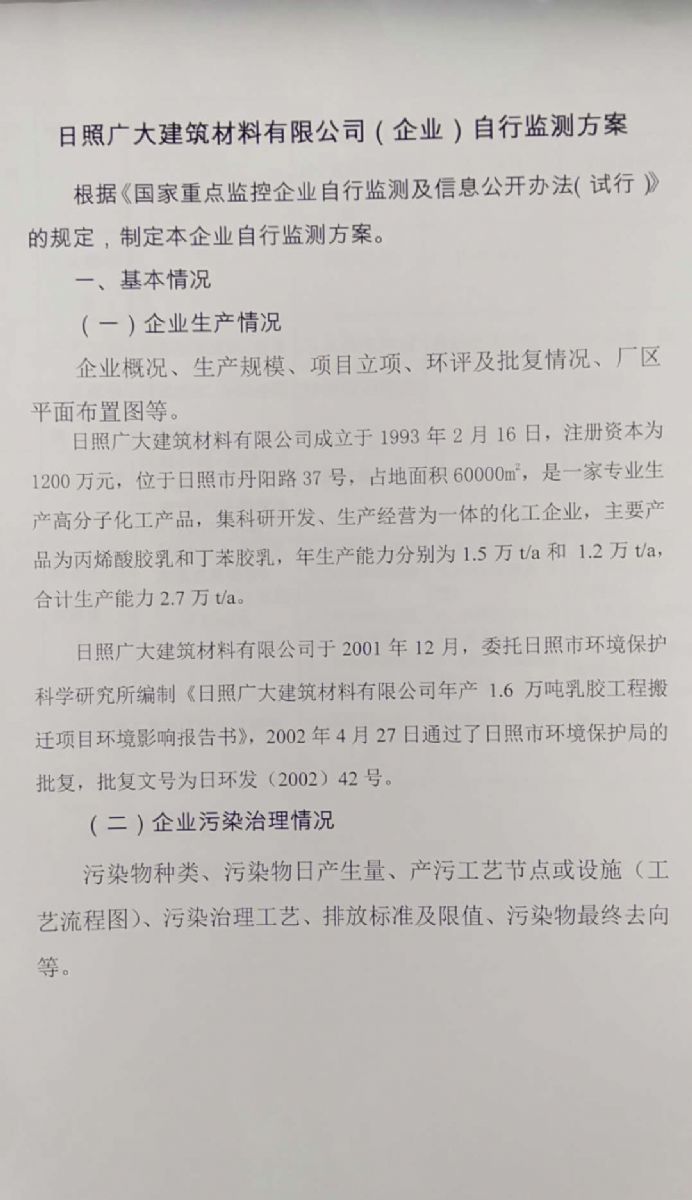 日照廣大建筑材料有限公司,位于風景秀麗的海濱城市山東日照,成立于1988年,是專業(yè)生產(chǎn)高分子化工產(chǎn)品,集科研開發(fā)、生產(chǎn)經(jīng)營為一體的化工企業(yè),主要產(chǎn)品為丙烯酸脂類乳液和丁苯膠乳。是國內(nèi)目前江北同行業(yè)產(chǎn)銷量最大企業(yè)之一。