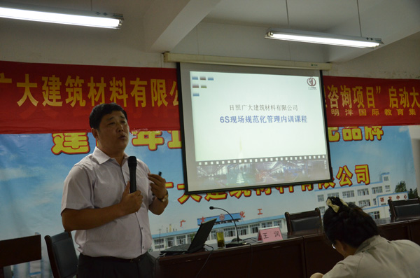 2015年7月14日,日照廣大建筑材料有限公司“6S規(guī)范化管理咨詢項(xiàng)目”啟動大會在研發(fā)中心大會議室隆重召開,公司董事長程永聚、副總經(jīng)理劉偉、許繡梅以及公司全體管理人員和各部門業(yè)務(wù)骨干近60人列席參會。項(xiàng)目啟動大會由辦公室主任王麗萍主持,明洋公司咨詢總監(jiān)王潤老師對廣大建材目前在企業(yè)管理方面尤其是生產(chǎn)管理方面存在的問題進(jìn)行簡單介紹,同時對此項(xiàng)目的咨詢內(nèi)容、推進(jìn)步驟、咨詢目標(biāo)、項(xiàng)目推進(jìn)計(jì)劃等做了詳細(xì)講解。